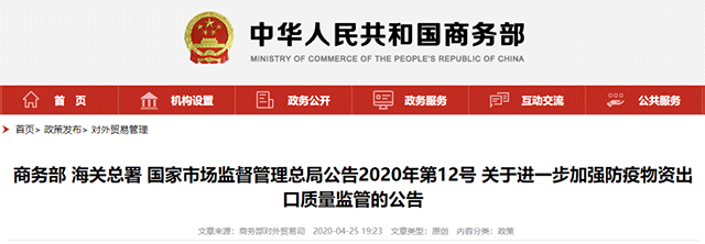 4月25日晚,国家商务部、海关总署、国家市场监督管理总局发布公告2020年第12号《关于进一步加强防疫物资出口质量监管的公告》。公告指出,自4月26日起,产品取得国外标准认证或注册的新型冠状病毒检测试剂、医用口罩、医用防护服、呼吸机、红外体温计的出口企业,报关时须提交电子或书面声明:承诺产品符合进口国(地区)质量标准和安全要求,海关凭商务部提供的取得国外标准认证或注册的生产企业清单(中国医药保健品进出口商会网站动态更新验收)。